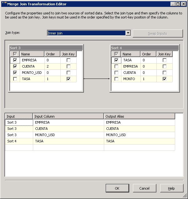 Ahora con estos campos agregados ya puedo usar el Merge Join, solo tenemos que indicarle que campos nos vamos a llevar del lado izquierdo y que campos del lado derecho.