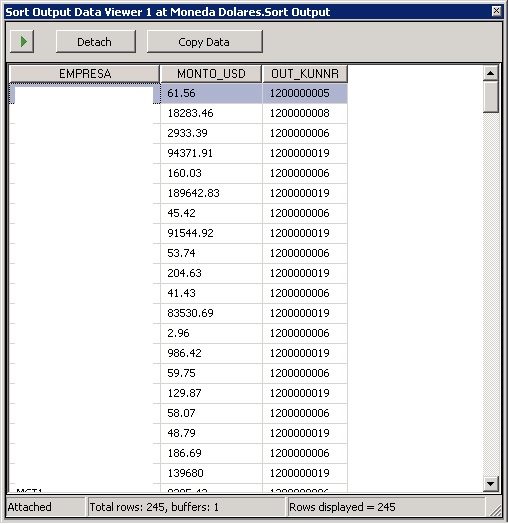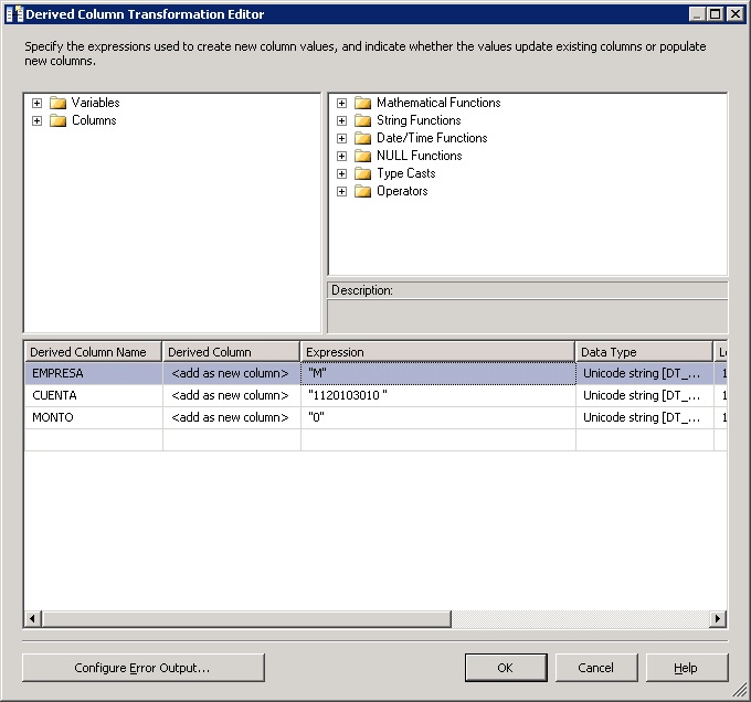 Lo que necesitaba es agregar este resultado y ponerlo como una columna nueva en la tabla anterior, para esto use el Merge Join, pero para que el Merge Join pudiera funcionar lo que hice fue agregar los mismo campos en ambos lados de las tablas es decir que la primera tabla le falta el tipo de cambio y a la ultima tabla le falta la empresa, cuenta, monto.