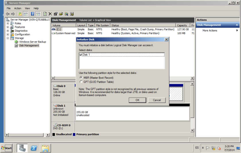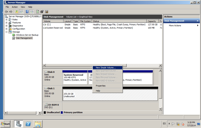 Ahora vamos al Server Manager de Windows y formateamos el disco para que nos aparezca.