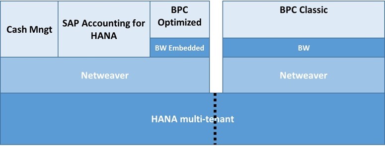 - BPC optimizado se ejecuta en el BW incorporado en el ERP, y sólo está disponible con S/4 HANA Finanzas (el componente SAP contabilidad para HANA es obligatorio).