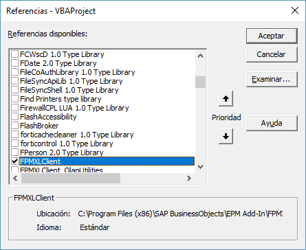 Lo primero que debemos de hacer es estar dentro del EPM, ingresamos a la consola de VBA, agregamos la referencia FPMXLClient en la siguiente ruta: Excel -> Desarrollador -> Visual Basic -> Herramientas -> Referencias.