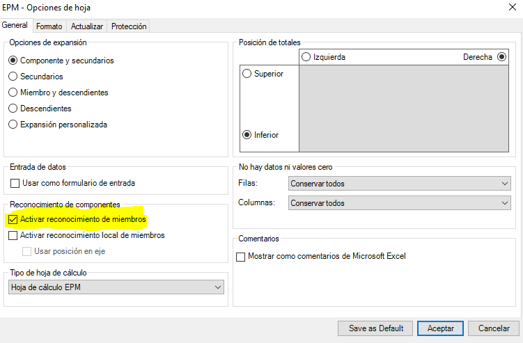 Antes de ejecutar el botón Activas, verifiquemos si el reconocimiento esta desactivado, en la siguiente ruta: EPM -> Herramientas -> Opciones de Hoja