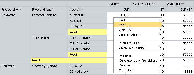 El menú contextual de la celda permite bloquear la celda de datos; esto indica que el valor de la celda debe ser fijo. También es posible bloquear todas las celdas en una fila o columna usando el menú contextual de la fila o columna, respectivamente.