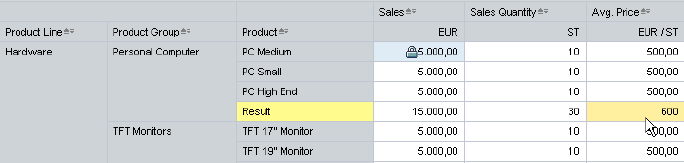 Como ayuda para controlar los cambios en el conjunto de resultados, es posible corregir los valores de celda en las plantillas web de BW. Supongamos que un valor de celda para ‘Ventas’ se fija en el nivel del producto y ‘Promedio. Price ‘fue cambiado en el primer subtotal. Luego se procesarán los siguientes pasos: