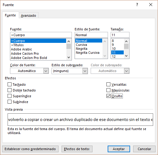 En la ventana que se abre a continuación, dentro de la sección efectos marcamos la opción Oculto y pulsamos Aceptar. De esta manera, el texto seleccionado quedará oculto para la impresora, aunque nosotros sigamos viéndolo en el documento.