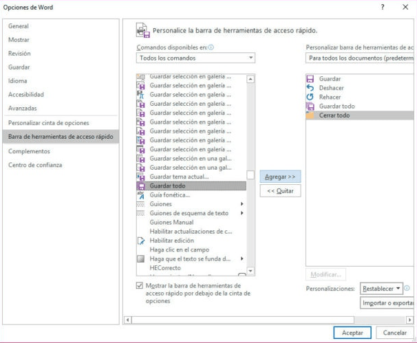 Para mostrar estos dos comandos debemos hacer clic sobre la pestaña o flecha que aparece en la barra de herramientas de acceso rápido y seleccionar la opción Más comandos. Esto nos muestra una nueva ventana donde podemos listar todos los comandos disponibles en Word y donde tenemos que buscar el de Guardar todo y Cerrar todo para añadirles a la barra de herramientas de acceso rápido. Una vez aceptemos los cambios ya encontraremos disponibles estas dos opciones en la barra de herramientas de acceso rápido.