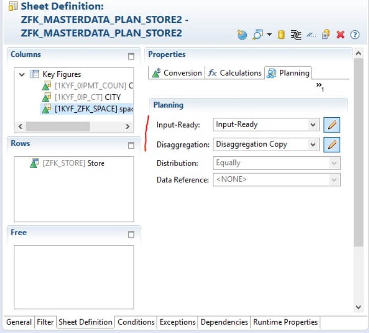 Al presionar el botón ‘Modo de planificación’ puede alternar entre: Se puede planificar el destino de datos en tiempo real, no se permite la carga de datos. Para hacer la planificación necesitamos crear una consulta preparada para la entrada en la parte superior como para los proveedores de información normales. Todas las claves y atributos que deben planificarse deben marcarse como Listo para entrada. El comportamiento de desagregación es el mismo que para las cifras clave de NO2 o SID ‘Copia de desagregación’.