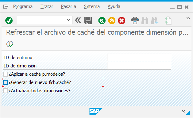 Utilice el programa UJA_REFRESH_DIM_CACHE para sincronizar la tabla de dimensión dinámica y la tabla de dimensión BW. Esto borra el caché, pero no elimina miembros de dimensión ni datos de transacción. Para ejecutar UJA_REFRESH_DIM_CACHE, inicie sesión en el servidor BW, vaya al código de transacción SE38 y luego ejecute UJA_REFRESH_DIM_CACHE.