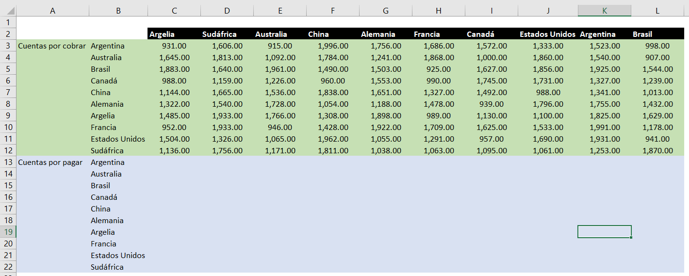 Por lo cual es necesario que copiar los valores de la siguiente forma, como por ejemplo en la celda C3 el monto que Argelia le vendió Argentina 931.00 lo debo copiar en la celda K19 para poder cuadrar el valor que Argentina le debe a Argelia, que debe ser los mismos 931.00.