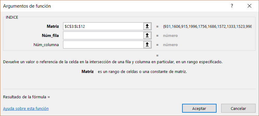 Primero vamos a conocer a nuestro amigo INDICE, esta formula devuelve el valor en la intersección de una fila y columna.