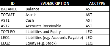 Tenga en cuenta que las cuentas del Balance General son de tipo AST y LEQ, que representan Activos, Pasivos y patrimonio.