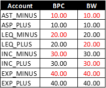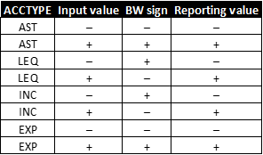 Veamos qué datos de signos se almacenan a nivel de BW para diferentes tipos de cuentas. La tabla de signo de entrada a nivel BPC, signo BW correspondiente.