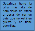 Según estadísticas de la policía de Sudáfrica, se cree que una media de 50 asesinatos por día, y se cree también que una de cada tres mujeres ha sufrido violación, es decir, que para vivir en Sudáfrica hay que andar con los ojos bien abiertos (Viviendo en el pais mas criminal de africa, 2016)