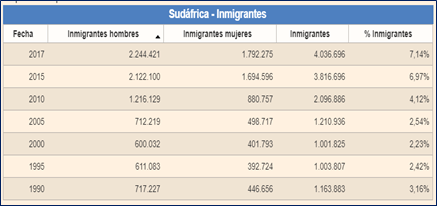 Tabla 1: Inmigrantes en Sudáfrica