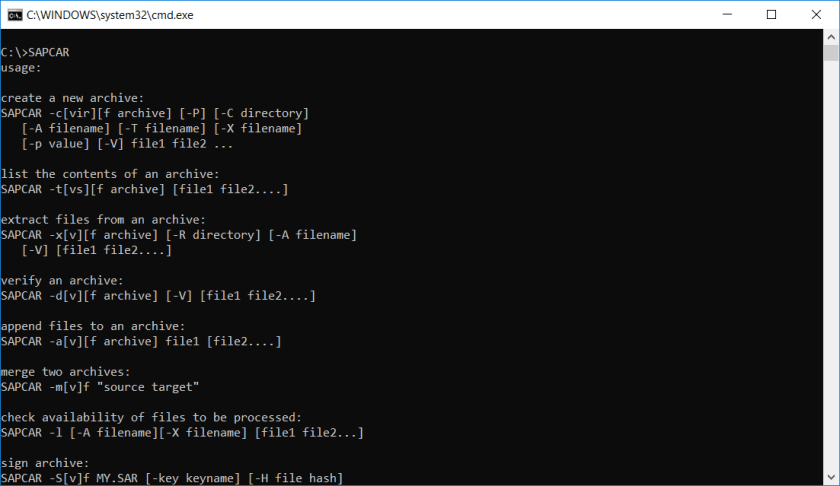 Con la herramienta SAPCAR, puede enumerar, extraer y comprimir los archivos .SAR o .CAR. Las funciones son similares a las herramientas estándar como WinZip, WinRAR y etc.