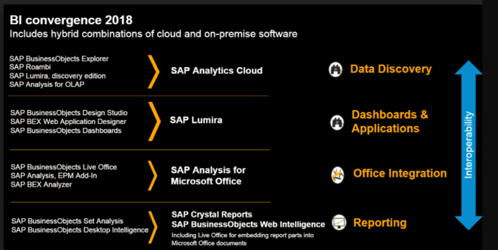 Parece que la mayoría de estas funciones se integran en el análisis de SAP para la nube, puede que haya menos herramientas en el portafolio de análisis en un futuro cercano, pero no voy a entrar en los detalles de las características de inteligencia empresarial en este blog.