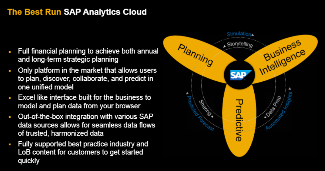 Por otro lado, la nube de SAP Analytics Cloud está diseñada para combinar la inteligencia empresarial con la planificación y el análisis predictivo.