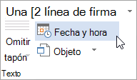 Si no necesita la fecha se actualice automáticamente, puede insertar la fecha actual como texto. En el grupo Texto de la pestaña Insertar, haga clic en Fecha y hora.