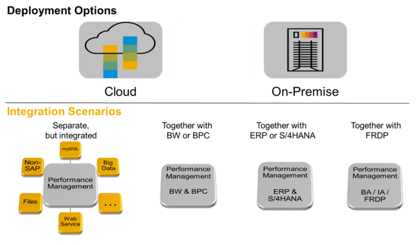 Se puede utilizar SAP Profitability and Performance Management en una instancia separada, pero de forma integrada con otros componentes de SAP y no SAP. Recomendamos implementar SAP Profitability and Performance Management lo más cerca posible de los datos relevantes. Si otras aplicaciones que contienen datos relevantes están ya instaladas en SAP HANA, se recomienda utilizar SAP Profitability and Performance Management en la misma plataforma de SAP HANA o incluso en la misma instancia para garantizar un rendimiento óptimo y la máxima reutilización de los datos existentes y metadatos, como jerarquías, datos maestros, etc. En este caso, otros escenarios de implementación típicos se encuentran en la misma instancia que BW y BPC, ERP, o la plataforma de datos financieros y de riesgo (FRDP).