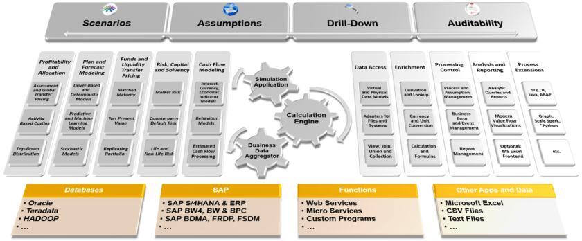 El motor de cálculo de SAP Profitability and Performance Management permite a los usuarios empresariales diseñar y ejecutar modelos financieros y empresariales mediante la configuración y combinación de funciones en las áreas siguientes: