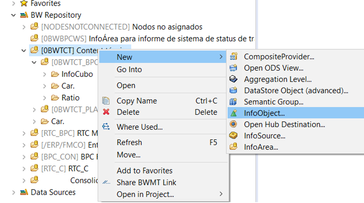 Lo primero que tenemos que hacer es entrar a HANA Studio a la perspectiva BW, ya estando alli le vamos a dar clic derecho a un InfoSitio y luego clic en New – > InfoObject