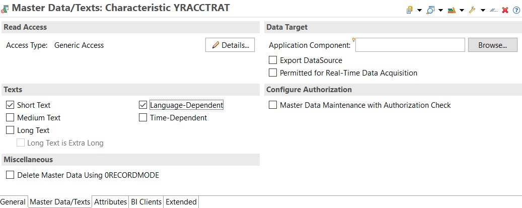 En la pestaña General, en la sección Dictionary podemos editar el tipo de datos y la longitud de los datos, en la sección Properties podemos debemos seleccionar Master Data y Text, el primero nos indica que esta característica es un dato maestros y el segundo indica que es un texto.