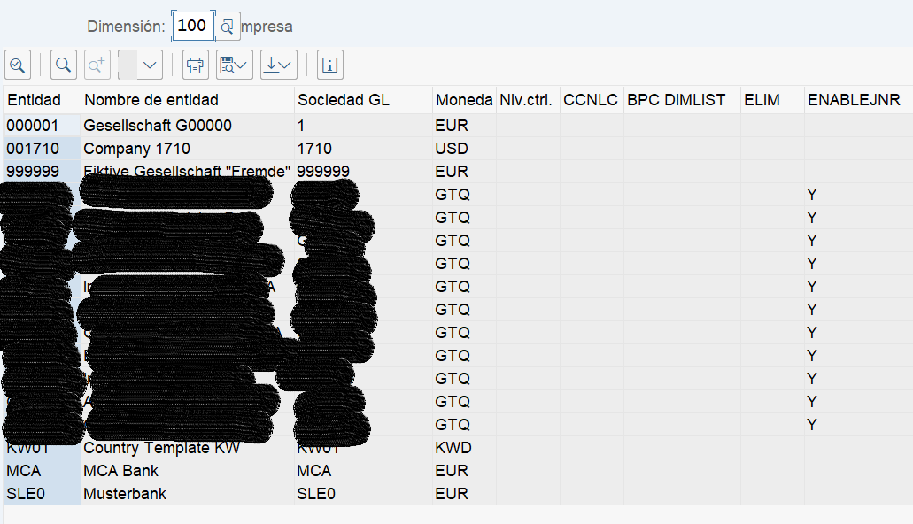 No hay problema, vamos a la transacción RTCENT para agregar Y en la propiedad ENABLEJNR, para cambiarlo directamente, y nos damos cuenta de que la entidad 100/NONE no aparece en el listado.