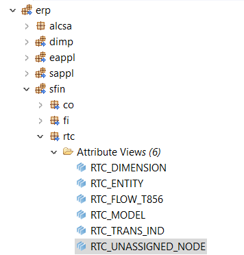 Para poder solucionar este error lo que tenemos que hacer es irnos a SAP HANA Studio y buscar la vista de atributo RTC_UNASSIGNED_NODE que esta en la ruta erp.sfin.rtc le damos doble clic.