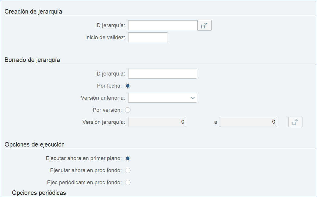 Nota: Antes de poder utilizar esta función para jerarquías basadas en conjuntos, debe especificar las jerarquías que son relevantes para la replicación en el Customizing para Controlling -> Inicio de la ruta de navegación -> Controlling general -> Siguiente paso de navegación -> Relevancia del informe de conjuntos para jerarquías -> Fin de la ruta de navegación . Puede acceder a esta aplicación en Customizing para Controlling bajo Inicio de la ruta de navegación -> General Controlling -> navegación Replicate Runtime Hierarchies Fin de la ruta de navegación o llamando a la transacción HRRP_REP.