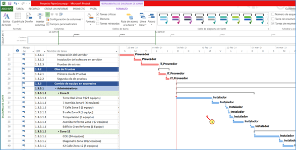 Al hacer todos los pasos como se indica, en la gráfica de Gantt se mostrará solamente la ruta crítica del proyecto.