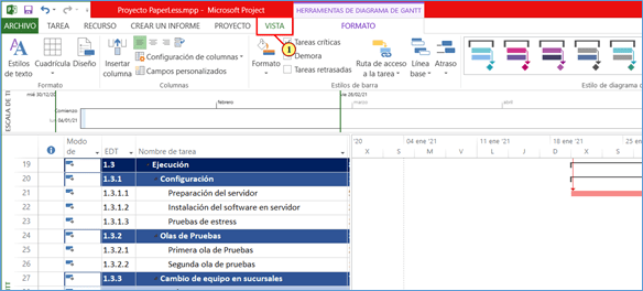 Por último, para mostrar la ruta critica es, ver en el grafica de Gantt solo las tareas que son críticas, para eso vamos a darle clic en la pestaña Vista.