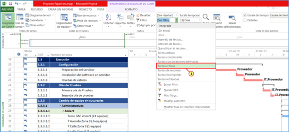 Y seleccionamos Tareas Criticas con esto, Microsoft Project nos va a mostrar la ruta crítica o las tareas que son críticas.