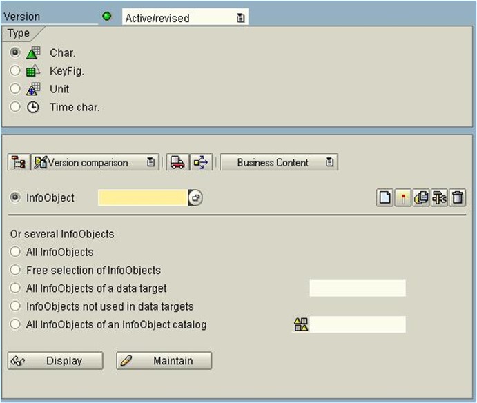 Antes de crear los InfoObjetos, se han de crear las infoáreas e InfoCatalogos necesarios (o emplear los ya existentes). Estos objetos tienen por misión, únicamente, facilitar la búsqueda y el acceso a los InfoObjetos, InfoCubos, etc. Un InfoArea permite agrupar InfoObjetos e InfoCubos. Un InfoCatalogo se emplea para agrupaciones de un tipo de InfoObjetos (características o ratios), exclusivamente.