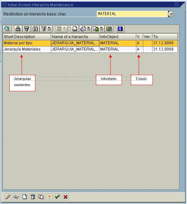 En el proceso de creación/modificación de un InfoObjeto, se podrán crear las jerarquías asociadas a éste desde la pestaña «Jerarquías», activando el flag «Con jerarquías» y con el pulsador «Tratar jerarquías». Se visualizará una pantalla con las jerarquías existentes y los iconos de tratamiento de las jerarquías.