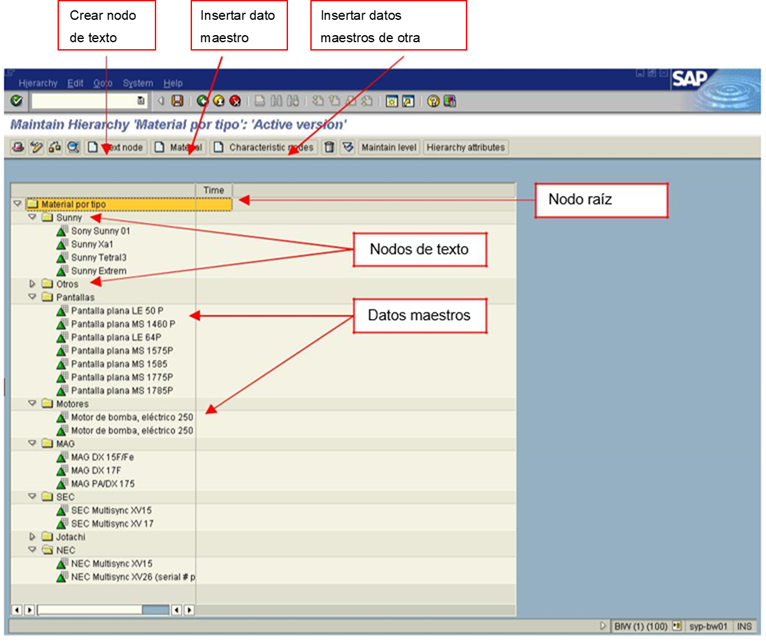 Una jerarquía está formada por nodos. Existe un nodo o raíz, a partir del cual se van creando la estructura. Todos los nodos al mismo nivel forman un nivel de jerarquía. Los nodos finales de la jerarquía serán siempre datos maestros de jerarquías.