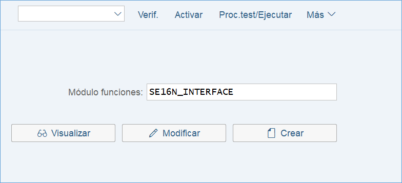 Como se muestra en la imagen anterior, esta tabla no tiene datos, entonces vamos a ingresar datos a esta tabla. Para hacer esto vamos a entrar a la transacción SE37 (Biblioteca de funciones), y luego vamos a ingresar la función SE16N_INTERFACE y ejecutar o F8.