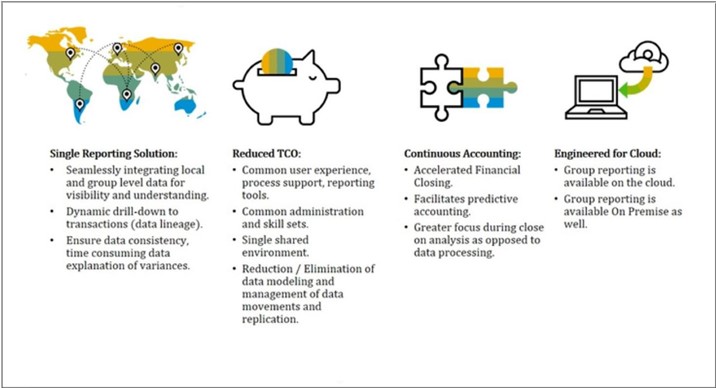 Los informes consolidados tratan de expandir el valor de una vista local a una vista de grupo y mostrar declaraciones como una entidad unida. En un sistema, los errores se pueden encontrar al principio del proceso, por lo que al final de cada cierre, los datos ya están preparados y en buen estado. Todos los detalles están disponibles automáticamente para las necesidades de informes de gestión flexibles y en constante cambio en la era digital. También proporciona la base para aplicar técnicas predictivas y una mayor automatización de los procesos.