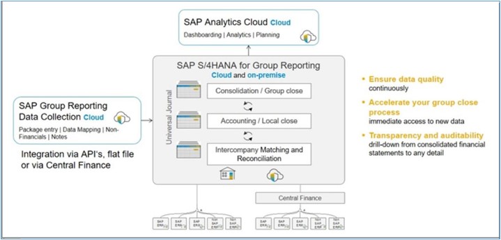 Existe la capacidad de ejecutar la consolidación de los datos que se han capturado en el Diario Universal: ya sea directamente para aquellas empresas que utilizan S/4HANA Accounting como su sistema de contabilidad, o a través de Central Finance, que en tiempo real puede llevar datos a S/4HANA Contabilidad, incluso si el Grupo tiene muchos sistemas ERP SAP y no SAP diferentes.
