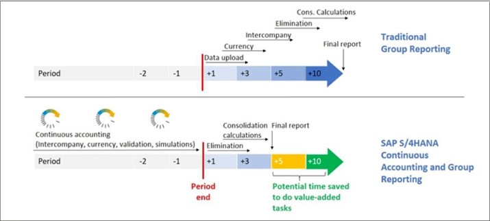 Desde una perspectiva de contabilidad continua, la consolidación financiera juega un papel importante en proporcionar información a la empresa más rápidamente. Pasar a un cierre de grupo virtual y realizar más tareas de consolidación en tiempo real puede proporcionar una perspectiva detallada del negocio en cualquier momento del período. Si las consolidaciones y la planificación se combinan en una sola aplicación, proporciona el vehículo perfecto para impulsar pronósticos continuos para obtener resultados consolidados en tiempo real. Combine esto con las capacidades de contabilidad predictiva de SAP S/4HANA Finance, estamos avanzando rápidamente hacia el suministro de los mejores datos disponibles y varios escenarios a los tomadores de decisiones en cualquier momento durante el período.