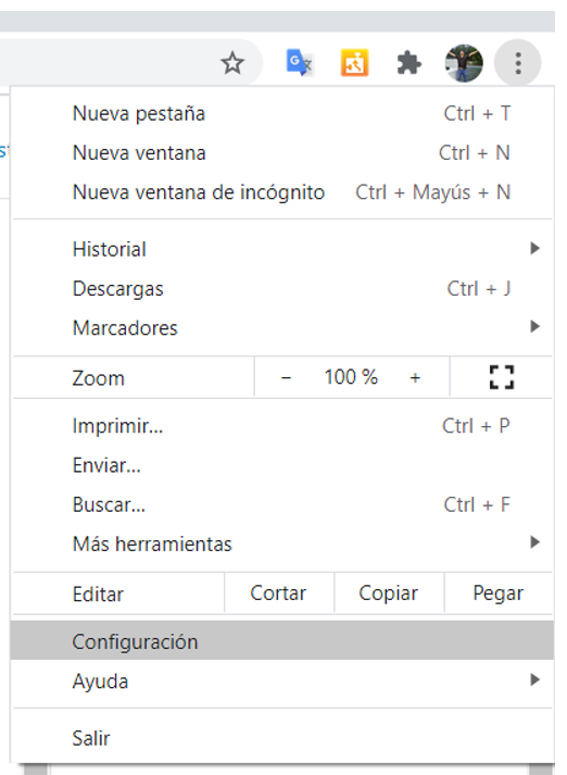 - Abrir la configuración de Google Chrome, dando clic en los 3 puntos que tiene el navegador del lado derecho y despues clic en Configuración