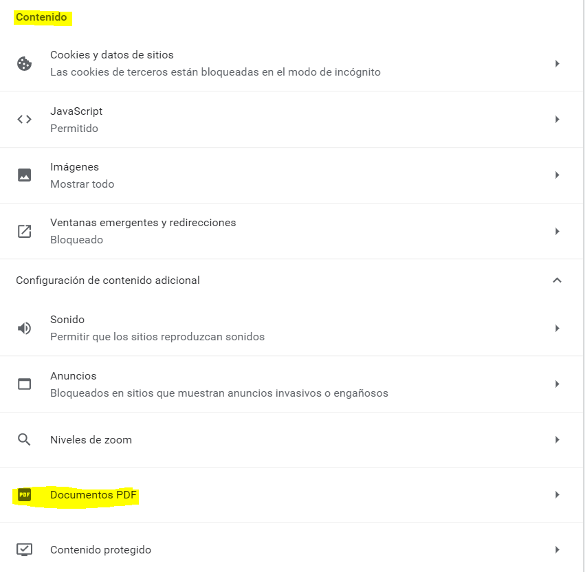 - Se busca el cuadro de opciones Contenido despues buscamos el botón Documentos PDF