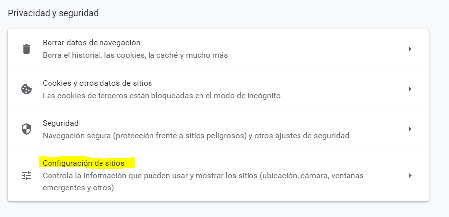 - Bajamos y buscamos nuevamente las opciones de Privacidad y seguridad, luego dar clic en la opción Configuración de sitios