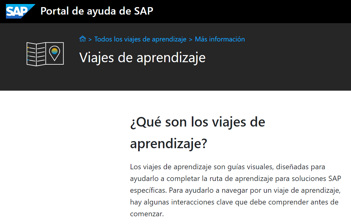 Learning Journeys son guías visuales estructuradas, diseñadas para ayudarlo a completar la ruta de aprendizaje para una solución SAP en particular. Para obtener más información sobre los viajes de aprendizaje, siga este enlace Viajes de aprendizaje.