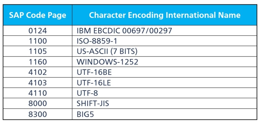 Otras páginas de códigos de SAP : 1401 (idiomas de Europa del Este), 8000 (japonés), 8400 (chino simplificado), 8300 (chino tradicional), 1500 (ruso) y más también se basan en una página de códigos ISO 8859.