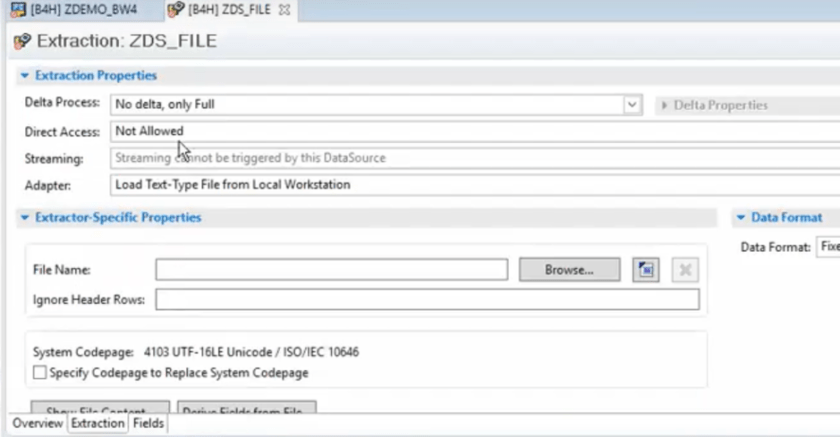La primera es cargar archivos de tipo texto desde el servidor de aplicaciones. Deberá configurar una rutina para procesar los archivos planos. Para hacer esto en SAP BW, consulte la primera figura a continuación. Para hacer esto en SAP BW4HANA, consulte la segunda figura.