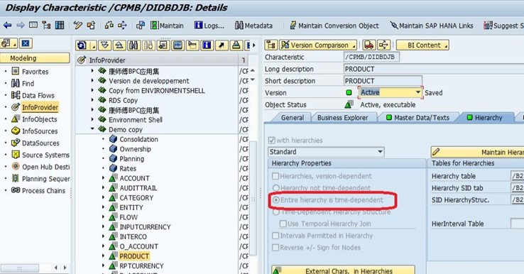 En ABAP WorkBench, el código de transacción RSA1 -> Seleccione Modelado -> Seleccione InfoProvider-> Expandir entorno -> dimensión del botón derecho PRODUCTO -> Seleccione Mostrar -> Seleccione Jerarquía en el panel derecho, la jerarquía se ha establecido en Dependiente del tiempo para toda la jerarquía.