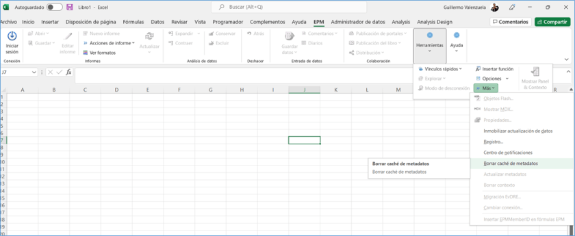 cache de los metadatos ingresar a la siguiente ruta: Excel → EPM → Herramientas →Mas → Borrar caché de metadatos