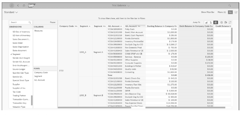 El informe de Balance de Comprobación se utiliza para validar los saldos de las cuentas al preparar los estados financieros segmentados. Con SAP S/4HANA, se introdujeron dos aplicaciones de balance de prueba: Balance de prueba (ID de aplicación F0996A) y Comparación de balance de prueba (ID de aplicación F2767). Ambas son aplicaciones de análisis que admiten el análisis multidimensional y leen del Universal Journal. El análisis multidimensional de la consulta detrás de las aplicaciones le permite analizar conjuntos de resultados para cualquier dimensión disponible.