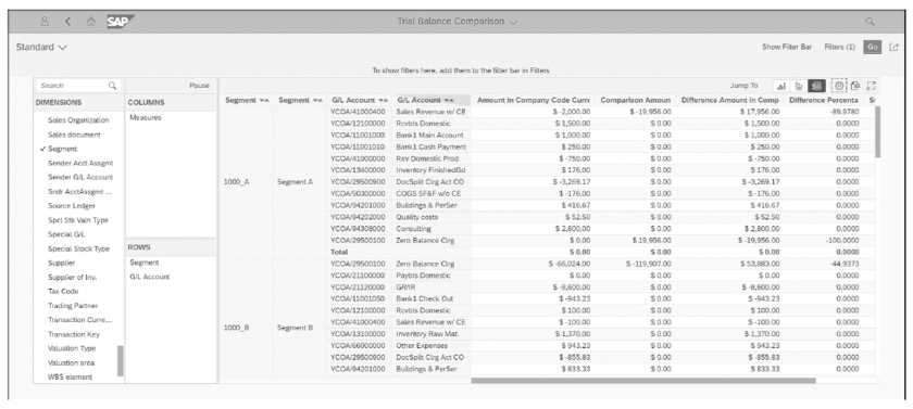 Por ejemplo, puede agregar dimensiones de informes de segmento, como segmento o centro de beneficios, y actualizar los valores de filtro para estas dimensiones. Después de hacer clic en el botón Aceptar , los resultados aparecerán en la pantalla de la aplicación SAP Fiori.