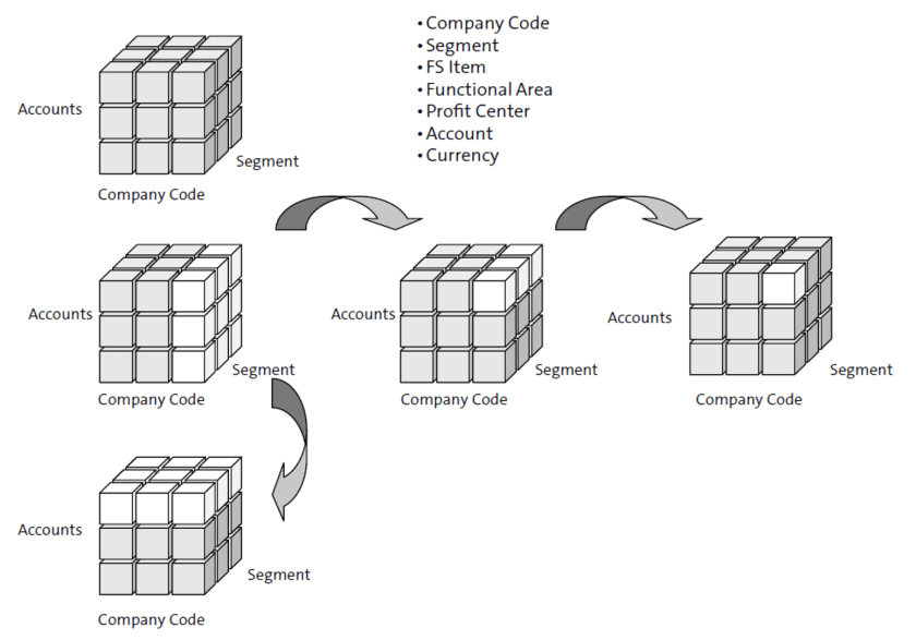 El mecanismo de informes detallados se basa en un principio de conjuntos de datos multidimensionales. El principio de desglose se ilustra a continuación, que muestra un conjunto de datos tridimensionales representado por un cubo. Por lo general, los informes tienen más de tres dimensiones, pero con fines ilustrativos, usamos solo tres: cuentas, código de empresa y segmento. Cada cubo se compone de 27 cubos pequeños. El borde del cubo pequeño representa el valor de la dimensión. Puede mirar cubos pequeños individuales dentro del cubo o secciones transversales del cubo. Al intercambiar características, puede ver los datos desde diferentes perspectivas.